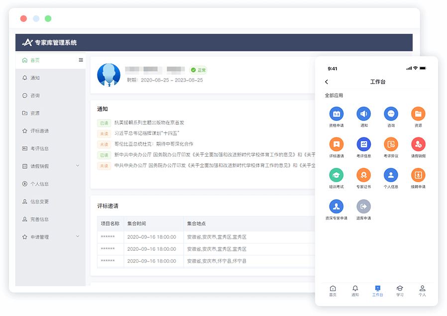 主要包括人臉識別、身份驗證、注冊、入庫申請、學習、考試、知識庫、專家證書、信息變更、咨詢、通知、評標邀請、請假銷假、數(shù)字證書申請、手寫電子簽名、考評信息、考評異議、續(xù)聘申請、資深專家申請、個人信息管理等。