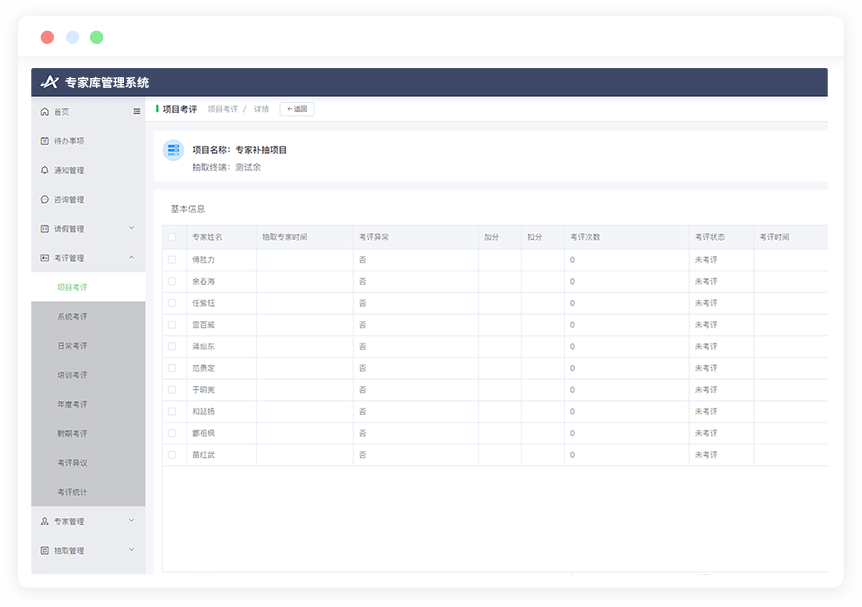 主要包括專家評標活動考評(支持分值、考評指標自定義)、追加考評、系統(tǒng)考評(未接聽、拒絕參評、長期請假)、培訓考評、年度考評、聘期考評、考評異議管理、考評統(tǒng)計等。